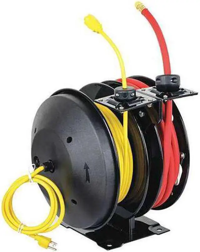 California Proposition 65: This product contains a chemical known to the State of California to cause birth defects or other reproductive harm. Dual Reel Spring Return Hose Reel, Air, Electric, 0 psi, 300 psi, Combination Type Air/Electric, Hose Capacity 25 ft (3/8 in I. D. ), Includes Hose Yes, Mounting Location Ceiling, Floor, Wall, Overall Height 16 in, Overall Length 14 in, Overall Width 16 in, Feeder Cord Ending Configuration NEMA 1-15P, Retractable Cord Ending Configuration NEMA 5-15R, Drive Type Spring Return, Enclosed No, Cord Color Yellow, Cord Current 13 A, Cord Gauge 14 AWG, Voltage 120 V AC, Seal Material Rubber. This item has been restricted from sale in the following state (s): []