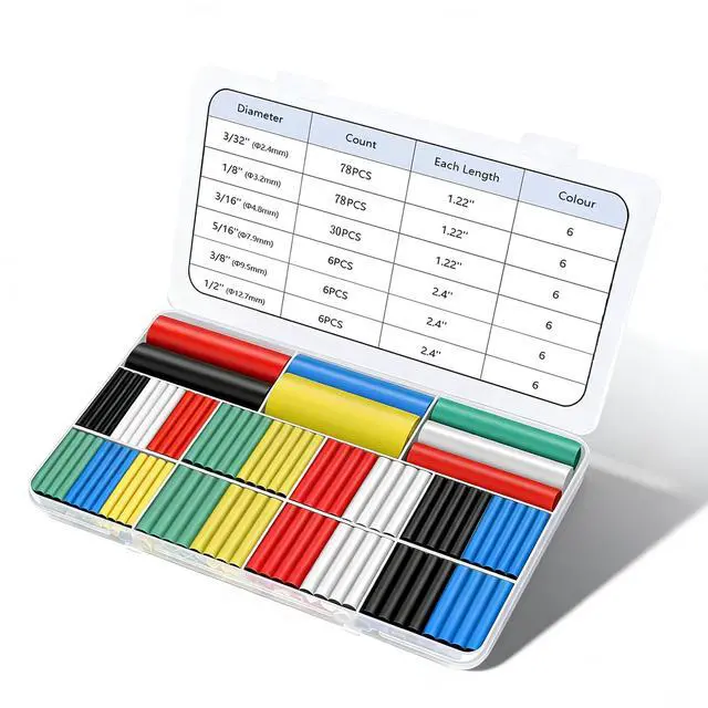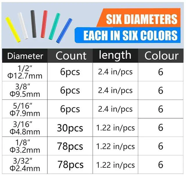 • SPECIFICATIONS & QUANTITY: Eugiichr Heat Shrink Tubing Kit contains 6 pcs of 1/2" (2.4" long), 6 pcs of 3/8" (2.4" long), 6 pcs of 5/16" (2.4" long), 42 pcs of 3/16" (1.22" long), 72 pcs of 1/8" (1.22" long) and 72 pcs of 3/32" (1.22" long), This heat shrink tubing kit includes six diameters, each in six colors (black, red, blue, yellow, green, white).