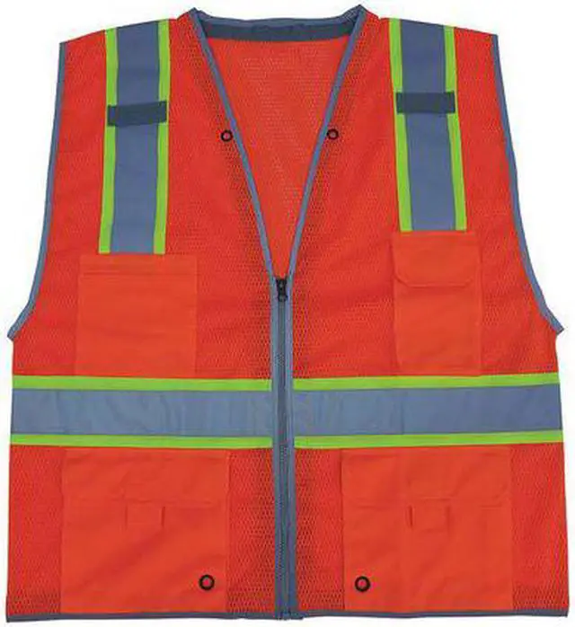 California Proposition 65: This product contains a chemical known to the State of California to cause birth defects or other reproductive harm. High Visibility Vest, ANSI Class 2, Vest Size 5XL, Traffic Safety Vest Color Orange/Red, Fits Chest Size 64 in to 66 in, Gender Men's, Stripe Color Silver, Vest Material Polyester Mesh, Vest Closure Type Zipper, ATPV Rating Not Rated, Vest Stripe Color Family Green/Yellow/Silver, Back Stripe Pattern U, Vest Length 26 in, Number of Pockets (Inside) 2, Number of Pockets (Outside) 4, Number of Pockets with Closure 3, Features Reinforced Webbing, Brilliant Trim Reflective Edging, and Grommets. This item has been restricted from sale in the following state (s): []