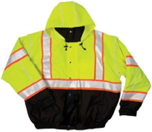 Jacket, Garment Type Jacket, Length Type Waist, Style Bomber Jacket, Back Stripe Pattern U, ANSI Class 3, ANSI Type R, Gender Unisex, Front Closure Type Zipper with Storm Flap, Color Black; Green, Size M, Number of Outside Pockets 2, Includes Hood Yes, Hood Style Packable Hood in Collar, Maximum Chest Size 42 in, Material Polyester, Includes Removable Liner Yes, Reflective Tape Type Glass Bead, Reflective Stripe Border Type Contrasting, Garment Features Black Bottom, Contrasting Stripes. This item has been restricted from sale in the following state (s): []