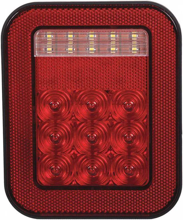 Stop/Turn/Tail Light, LED, Red Color, Mounting Surface, Power Source 12.8VDC, Current Drawn 0.20 to 0.14A DC, Base Material Polycarbonate, Housing Material Polycarbonate, Lens Material Polycarbonate, Lens Design Rectangular, Width 5-19/64 In., Depth 1-13/32 In., Height 6-1/2 In., Features Built In Reflector, Sealed Corrosion Proof Electronics. This item has been restricted from sale in the following state (s): []