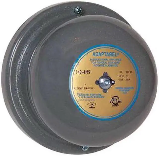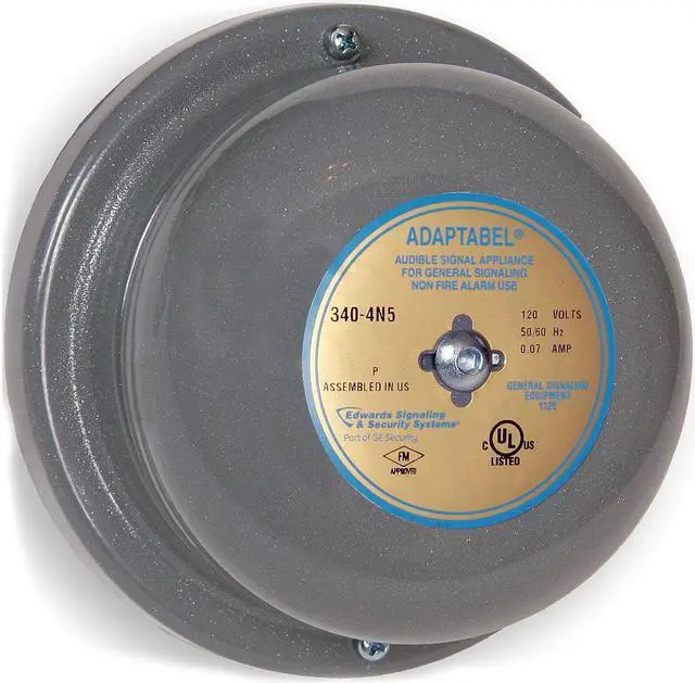 Audible Alarm Type Bell, Visual Indicator Type No Visual Indicator, Voltage 120V AC, Decibels 88 dB, Sound Pattern Continuous, Indoor/Outdoor Indoor, Outdoor, Mounting Surface, Height 4 in, Width 4.5 in, Depth 2.4063 in, Diameter 4.5 in, Vibrating Yes, Housing Material Steel, Features Weatherproof By Adding Appropriate Back Box, Standards FM, UL Listed, Amps 0.062A, Color Gray, Includes Hardware, Bell. This item has been restricted from sale in the following state (s): []