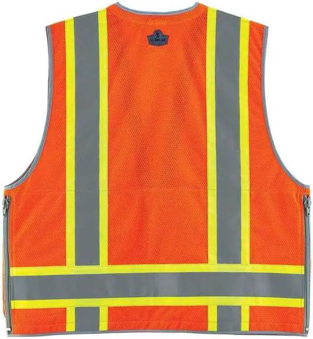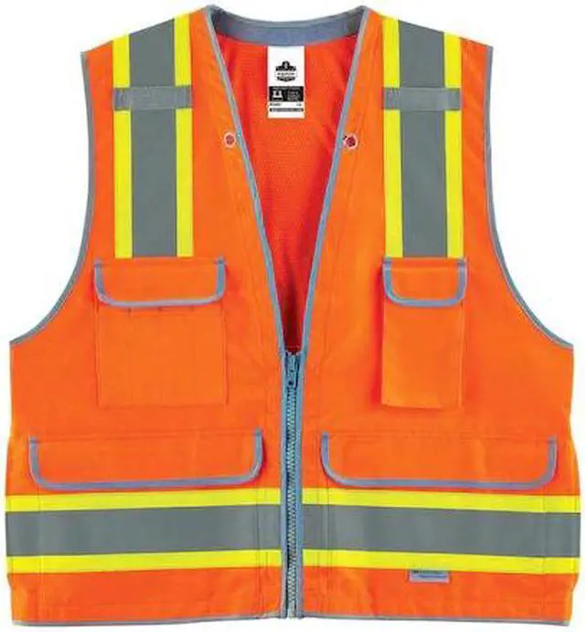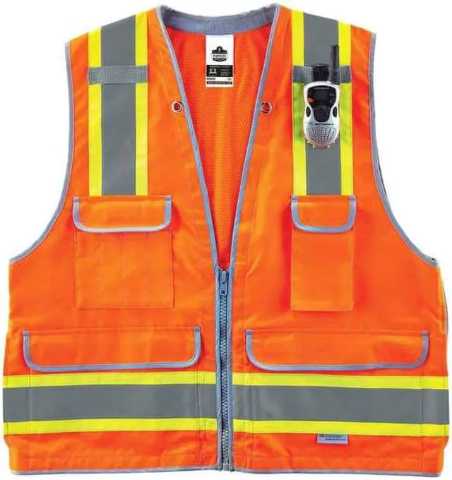 Ergodyne GloWear 8254Z Large/XL orange class 2 heavy-duty surveyor's vest is made of 5.3 oz polyester solid front and 4.1 oz mesh back for longer life. Vest with 4 outside pocket features a soft terry cloth neck zone and lanyard grommet holes.