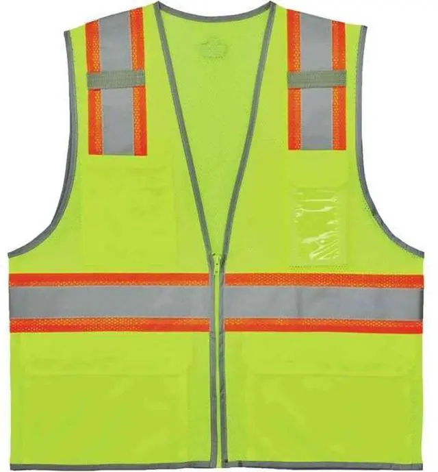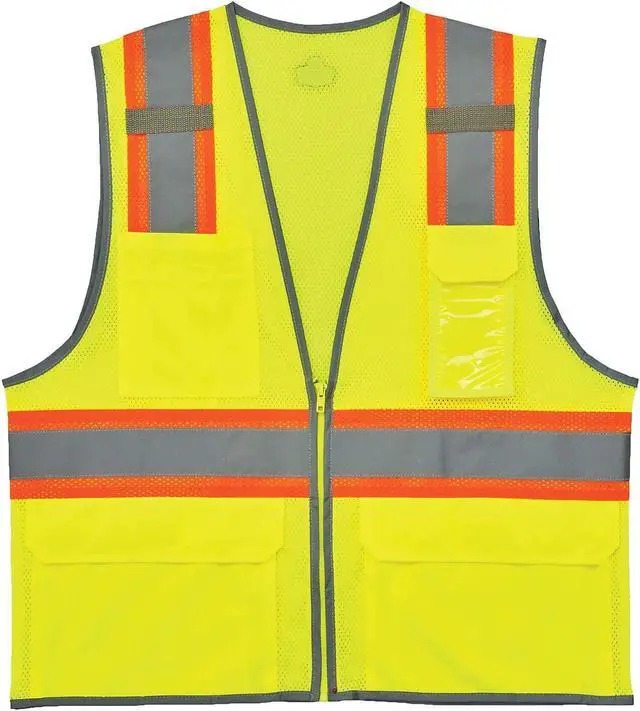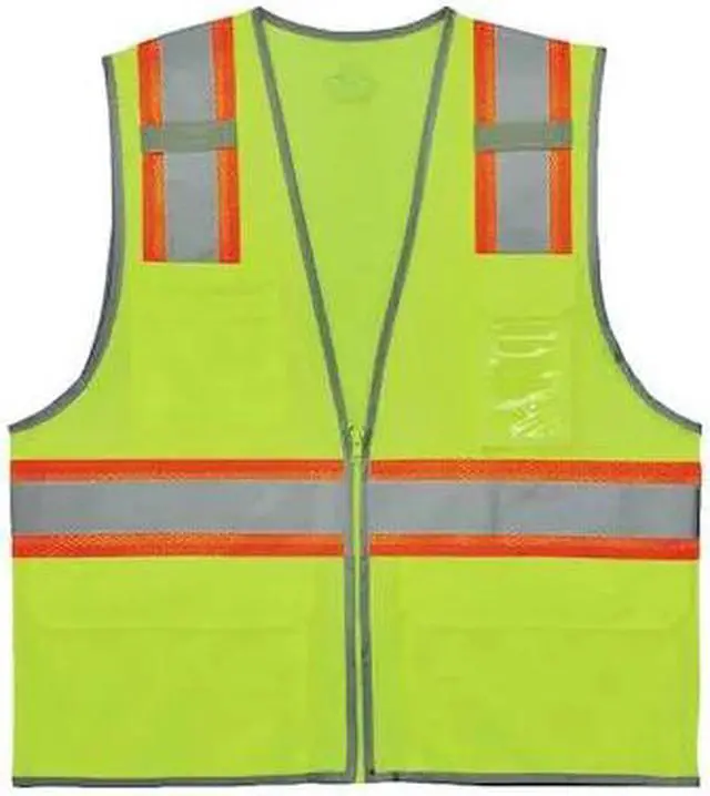 Two Tone Mesh Safety Vest, Lime, 4XL/5XL, ANSI Class 2, Vest Size 4XL, 5XL, Number of Pockets with Closure 3, Features Dual Radio Mic Tabs, ID Window, Reflective Binding Accents Outline the Wearer, Standards ANSI-Compliant