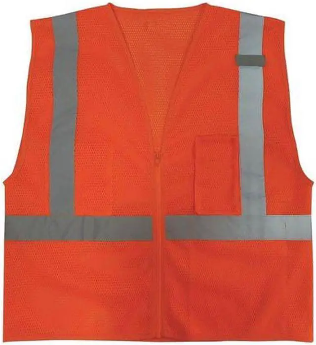 High Visibility Vest, ANSI Class 2, Vest Size 2XL, Traffic Safety Vest Color Orange/Red, Fits Chest Size 52 in to 54 in, Gender Unisex, Stripe Color Silver, Vest Material Polyester Mesh, Vest Closure Type Zipper, ATPV Rating Not Rated, Vest Stripe Color Family Silver, Back Stripe Pattern U-Block, Vest Length 27 in, Number of Pockets (Inside) 2, Number of Pockets (Outside) 1, Number of Pockets with Closure 1, Features Polyester Mesh, 2 in Wide Reflective Material, Standards ANSI/ISEA 107-2010. This item has been restricted from sale in the following state (s): []