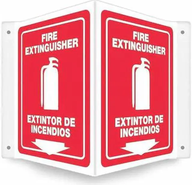 High Visibility Safety Sign, V-Shape Projection, Number of Printed Sides 1, English, Spanish, Sign Legend Fire Extinguisher/Extintor De Incendios, Sign Legend Background Color Red, Sign Legend Style Symbol and Text. This item has been restricted from sale in the following state (s): []