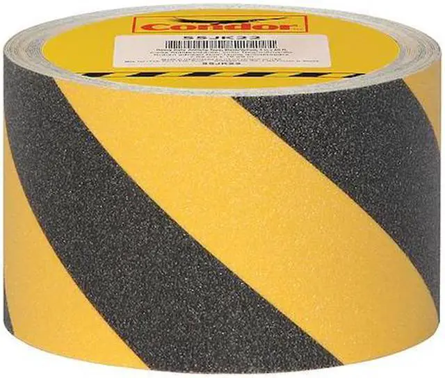 Width - Tape 4 in, Black/Yellow, Anti-Slip Tape, Aluminum Oxide, Acrylic Tape Adhesive, Continuous Roll Tape Shape, Length - Tape 60 ft, Striped Tape Pattern, Grit Size 46, Tape Adhesive Strength 75 oz/in, Glow-in-the-Dark No, Tape Legend No Legend, Thickness 0.03 in, Diameter 3 in, Kraft Paper, Die Cut No, Indoor/Outdoor Usage Indoor/Outdoor, -20 Degrees to 150 Degrees F, NSFI Certified for High Traction, Antislip Tape, Package Quantity 3. This item has been restricted from sale in the following state (s): []