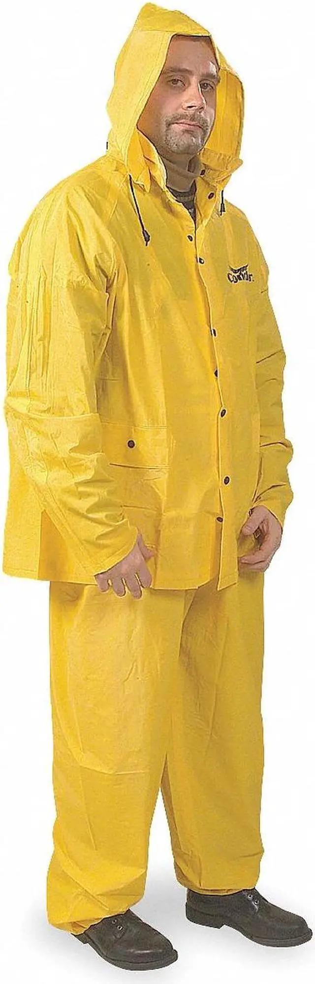 3-Piece Rain Suit with Jacket/Bib Overall, High Visibility No, Rainwear ANSI Class Unrated, M, Yellow, Rainwear Primary Material PVC, Hood Style Detachable, Hood Included Yes, Rainwear Ankle Style Snap, Rainwear Closure Type Snaps, Rainwear Cuff Style Snap, Fits Chest Size 54 in to 56 in, Fits Waist Size 32 in to 34 in, Unisex, Inseam 30 in, Jacket Length 30 1/4 in, Material PVC, Seam Style Sealed, Number of Pockets (Inside) 0, Number of Pockets (Outside) 2