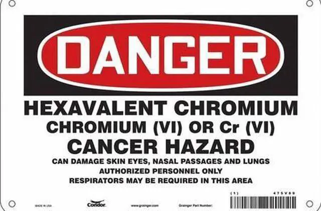 California Proposition 65: This product contains a chemical known to the State of California to cause birth defects or other reproductive harm. Safety Sign, Vertical Rectangle, Number of Printed Sides 1, English, Sign Format Traditional OSHA, Sign Legend Hexavalent Chromium Chromium (Vi) Or Cr (Vi) Cancer Hazard Can Damage Skin, Eyes, Nasal Passages And Lungs. Authorized Personnel Only. Respirators May Be Required In This Area., Sign Legend Background Color White, Sign Legend Style Text
