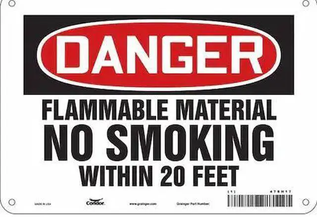 California Proposition 65: This product contains a chemical known to the State of California to cause birth defects or other reproductive harm. Danger Sign, Vertical Rectangle, Number of Printed Sides 1, English, Sign Format Traditional OSHA, Sign Legend Flammable Material No Smoking Within 20 Feet, Sign Legend Background Color White, Sign Legend Style Text
