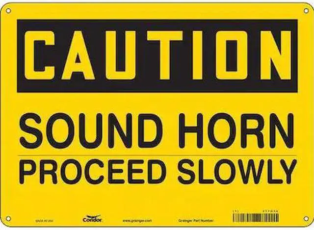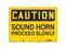 Safety Sign, Horizontal Rectangle, Number of Printed Sides 1, English, Sign Format Traditional OSHA, Sign Legend Sound Horn Proceed Slowly, Sign Legend Background Color Yellow, Sign Legend Style Text