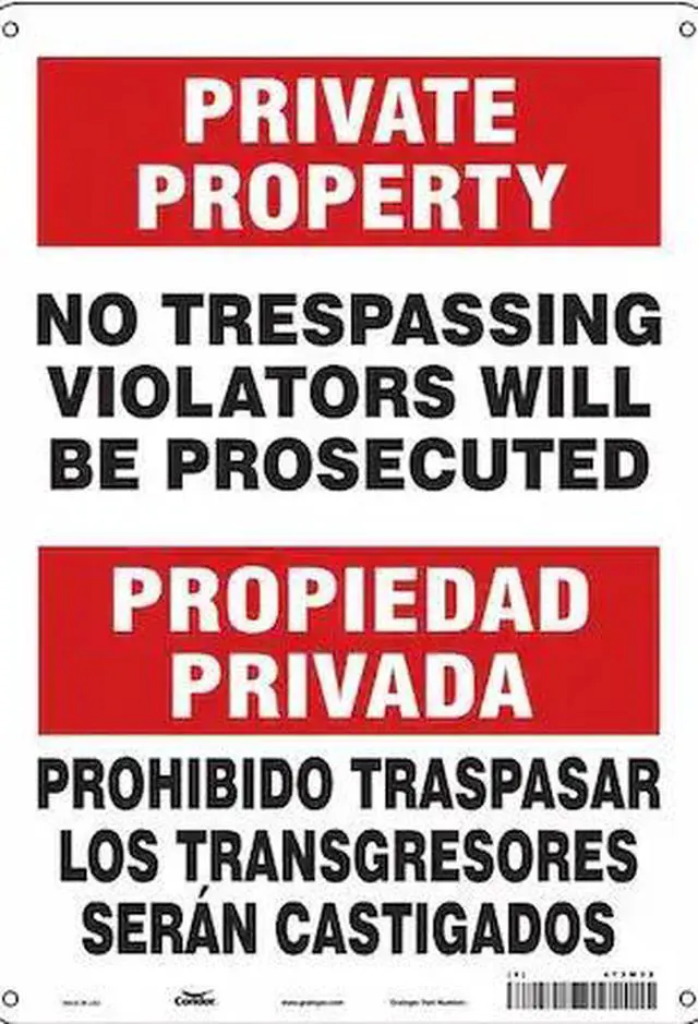 Safety Sign, Vertical Rectangle, Number of Printed Sides 1, English, Spanish, Sign Format Other Format, Sign Legend No Trespassing Violators Will Be Prosecuted/Propiedad Privada Prohibido Traspasar Los Transgresores Seran Castigados, Sign Legend Background Color Red, White, Sign Legend Style Text