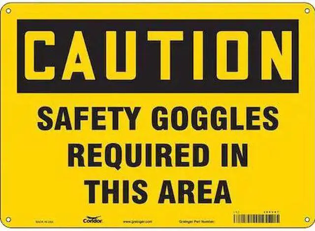 Safety Sign, Horizontal Rectangle, Number of Printed Sides 1, English, Sign Format Traditional OSHA, Sign Legend Safety Goggles Required In This Area, Sign Legend Background Color Yellow, Sign Legend Style Text