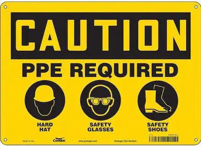 Safety Sign, Horizontal Rectangle, Number of Printed Sides 1, English, Sign Format Traditional OSHA, Sign Legend Ppe Required Hard Hat Safety Glasses Safety Shoes, Sign Legend Background Color Yellow, Sign Legend Style Symbol and Text