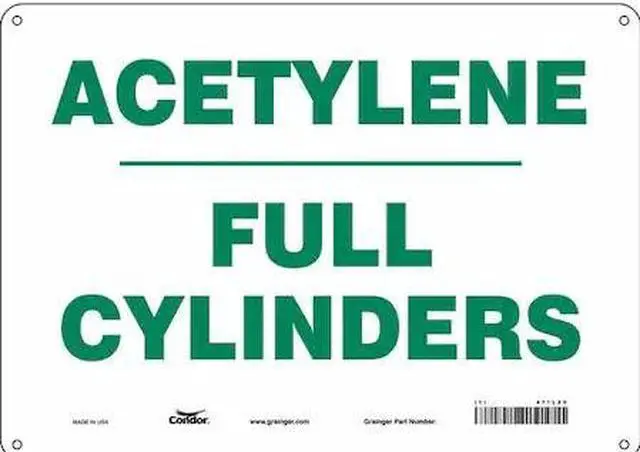 California Proposition 65: This product contains a chemical known to the State of California to cause birth defects or other reproductive harm. Safety Sign, Horizontal Rectangle, Number of Printed Sides 1, English, Sign Format Other Format, Sign Legend Acetylene Full Cylinders, Sign Legend Background Color White, Sign Legend Style Text