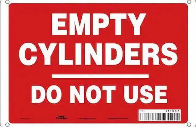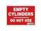 California Proposition 65: This product contains a chemical known to the State of California to cause birth defects or other reproductive harm. Safety Sign, Vertical Rectangle, Number of Printed Sides 1, English, Sign Format Other Format, Sign Legend Empty Cylinders Do Not Use, Sign Legend Background Color Red, Sign Legend Style Text