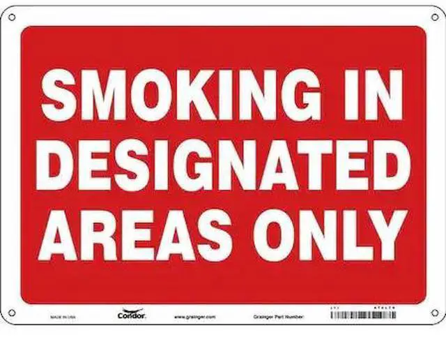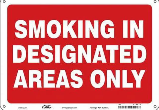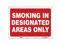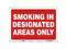 Safety Sign, Horizontal Rectangle, Number of Printed Sides 1, English, Sign Format Other Format, Sign Legend Smoking In Designated Areas Only, Sign Legend Background Color Red, White, Sign Legend Style Text