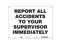 Safety Sign, Horizontal Rectangle, Number of Printed Sides 1, English, Sign Format Other Format, Sign Legend Report All Accidents To Your Supervisor Immediately, Sign Legend Background Color White, Sign Legend Style Text