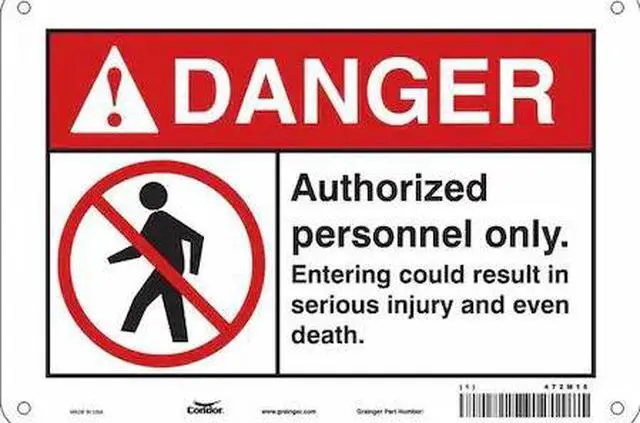 California Proposition 65: This product contains a chemical known to the State of California to cause birth defects or other reproductive harm. Safety Sign, Vertical Rectangle, Number of Printed Sides 1, English, Sign Format ANSI/OSHA Format, Sign Legend Authorized Personnel Only. Entering Could Result In Serious Injury And Even Death., Sign Legend Background Color White, Sign Legend Style Symbol and Text