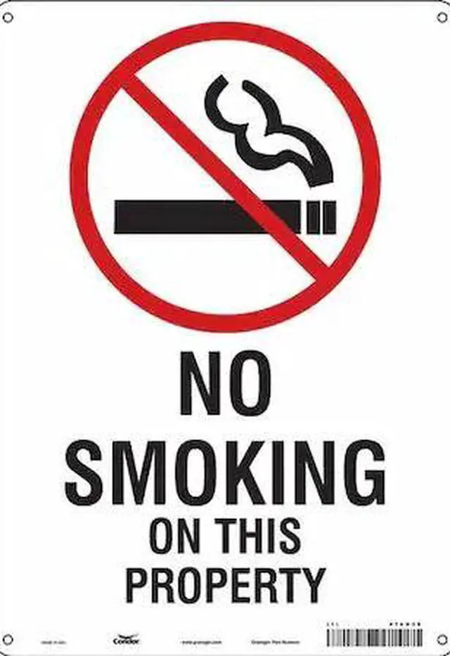 Safety Sign, Vertical Rectangle, Number of Printed Sides 1, English, Sign Format Other Format, Sign Legend No Smoking On This Property, Sign Legend Background Color White, Sign Legend Style Symbol and Text