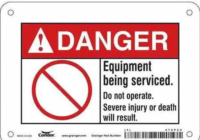 California Proposition 65: This product contains a chemical known to the State of California to cause birth defects or other reproductive harm. Safety Sign, Horizontal Rectangle, Number of Printed Sides 1, English, Sign Format ANSI/OSHA Format, Sign Legend Equipment Being Serviced. Do Not Operate. Severe Injury Or Death Will Result., Sign Legend Background Color White, Sign Legend Style Symbol and Text