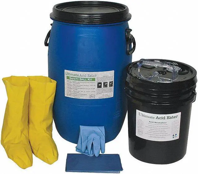 Neutralizing Spill Kit, Neutralizes Acids (Not for Hydrofluoric Acid or Hydrazine), Form Liquid, Container Size 15 gal., Container Type Drum, Includes Ultimate Acid Eater, (2) Pair of Gloves, (2) Pair of HazMat Boots, (2) Aprons, Instructions, MSDS Documents, Spill Eater Catalog, Tape