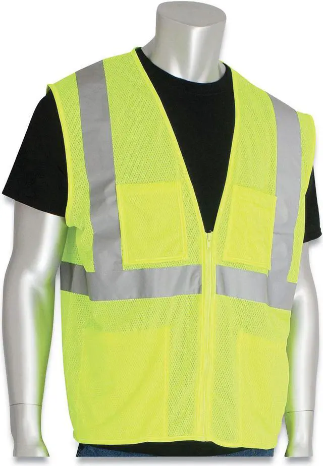 For workers exposed to traffic traveling over 25 mph and who work against complex backgrounds. Zipper enclosure for secure closure of vest. Features high-vis color and reflective 2" silver stripes that make you easy to see both night and day, so its ideal for a range of tasks where visibility is important. With a 100 percent polyester mesh fabric design and zipper closure, this vest is lightweight and easy to wear over clothing. Includes two lower internal pockets, two upper chest external pockets one including four pen pockets. Apparel Type: Vest; Material(s): Polyester Mesh; Color(s): Hi-Viz Lime Yellow; Color Family: Yellow.