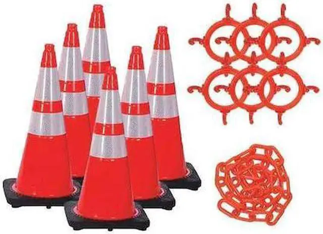 Traffic Cone Kit, Application Outdoor or Indoor, 28 in, Orange, UV Inhibited Polyethylene, Gloss Finish, Includes (6) Cone Chain Connectors, (6) Traffic Cones, 14 in x 14 in Base, 50 ft Plastic Chain. This item has been restricted from sale in the following state (s): []