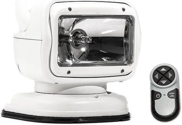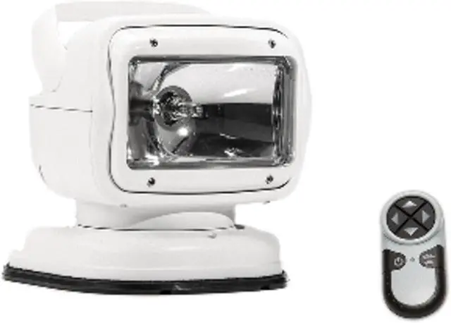 Spotlight, Type Wireless - Remote Controlled, Watts 65 W, Voltage 12V DC, Amps 5.5 A, Lamp Type Halogen, Candle Power 225, 000, Number of Heads 1, Vertical Axis Rotation 135 Degrees, Horizontal Axis Rotation 370 Degrees, Cable Length 15 ft, Height 8 in, Width 7.25 in, Depth 8 1/2 in, Body Color White, Body Material ASA Plastic. This item has been restricted from sale in the following state (s): []