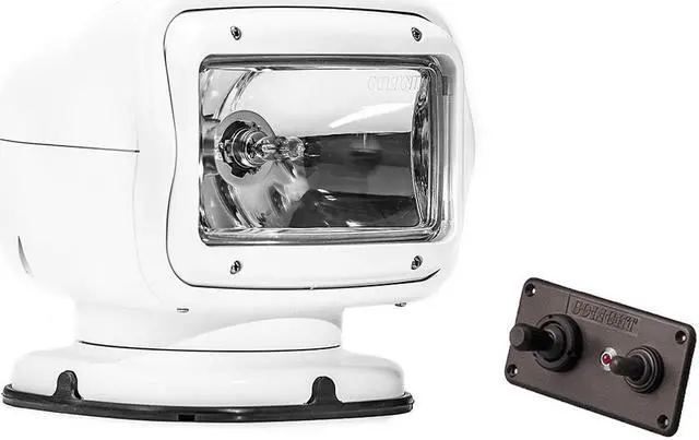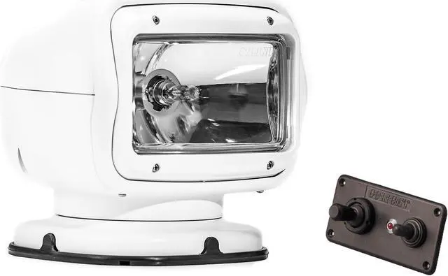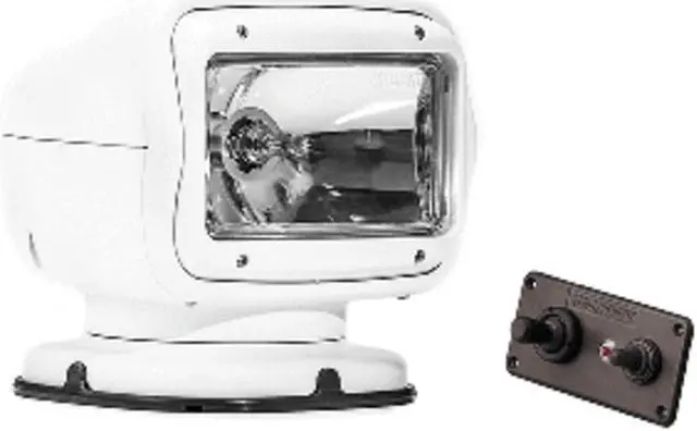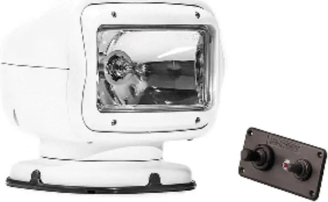 Spotlight, Type Hardwired - Remote Controlled, Watts 65 W, Voltage 12V DC, Amps 5.5 A, Lamp Type Halogen, Candle Power 225, 000, Number of Heads 1, Vertical Axis Rotation 135 Degrees, Horizontal Axis Rotation 370 Degrees, Cable Length 20 ft, Height 7.5 in, Width 7.25 in, Depth 6 7/10 in, Body Color White, Body Material ASA Plastic. This item has been restricted from sale in the following state (s): []