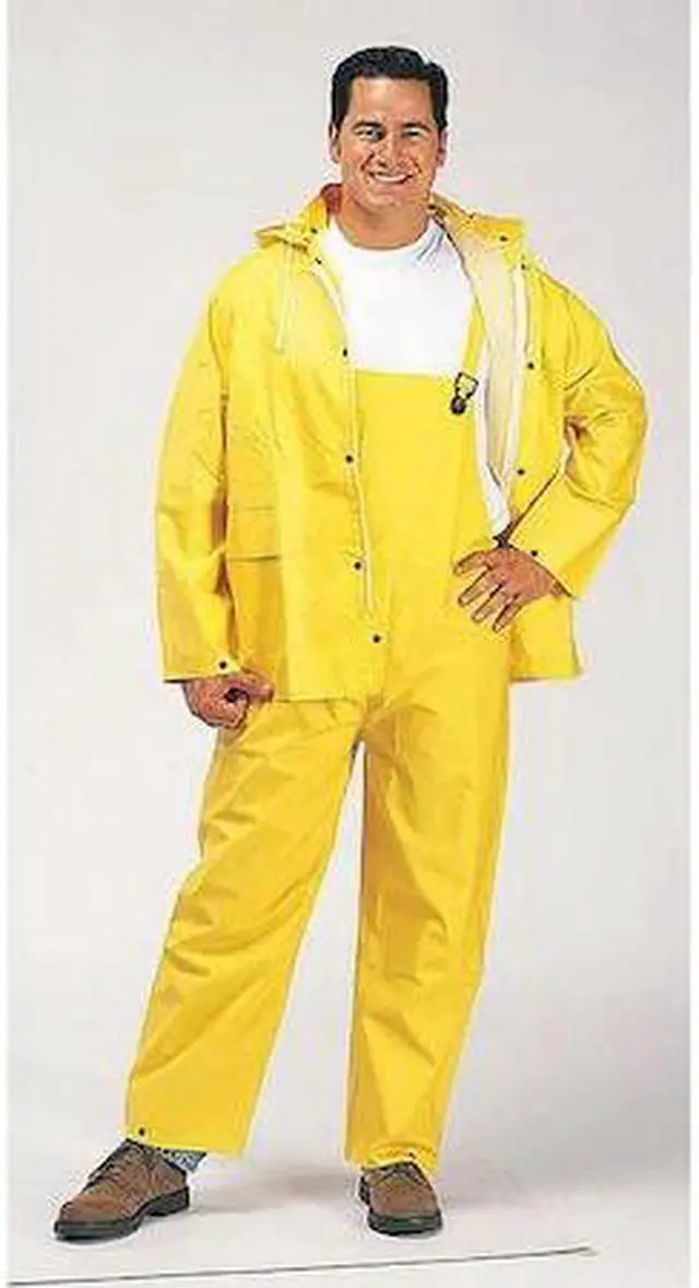 Three-Piece Rainsuit, Color Yellow, Material Polyester, PVC, Hood Style Detachable, ANSI Class Not Rated, High-Visibility No, Size XL, Jacket Length 32 in, Fly Closure Type Storm Flap, Zipper, Style 3 Piece Rain Suit with Jacket/Bib Overall, Includes Lining Yes, Lining Material Polyester, Thickness 0.35 mm, Features Heavy PVC Reinforced Joints, Underarm Air Vents, Includes Hood Yes, Number of Coat Pockets 2, ANSI Type Unrated, Jacket Entry Closure Type Zipper, Inseam 29 1/2 in. This item has been restricted from sale in the following state (s): []