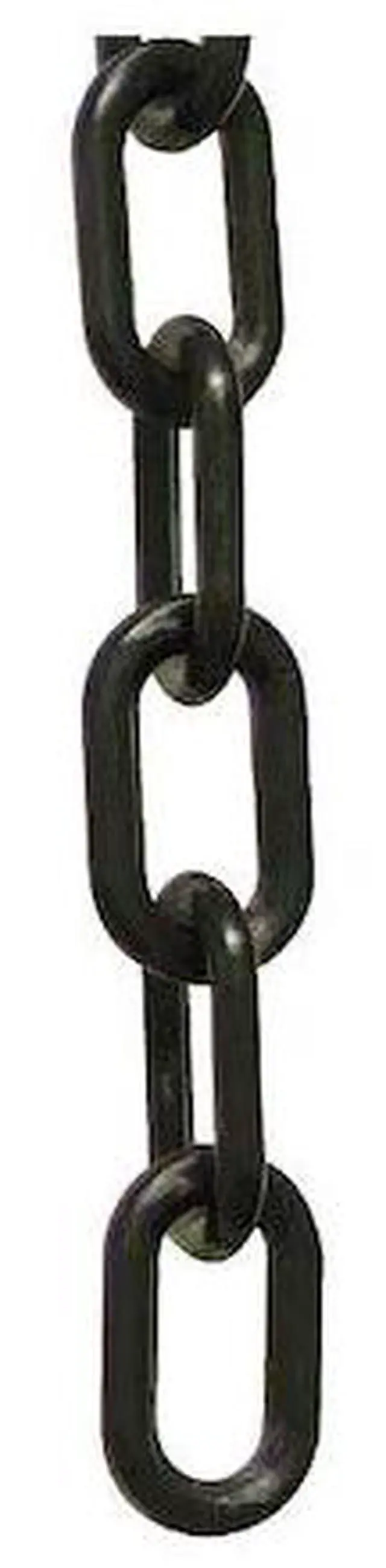 Plastic Chain, Length 25 ft, Color Black, Material Polyethylene, Finish Gloss, Link Outside Length 2.1 in, Link Outside Width 1.3 in, Link Inside Length 1.4 in, Link Inside Width 0.6 in, Reflectivity Non-Reflective, Indoor/Outdoor Usage Indoor, Outdoor, For Use With Chain Stanchions, Cone Connectors, Poles, Weight 3 lb, Resistance Properties Rust Resistant, UV Resistant, Standards WBENC Certified, Manufacturer Warranty Length 5 yr