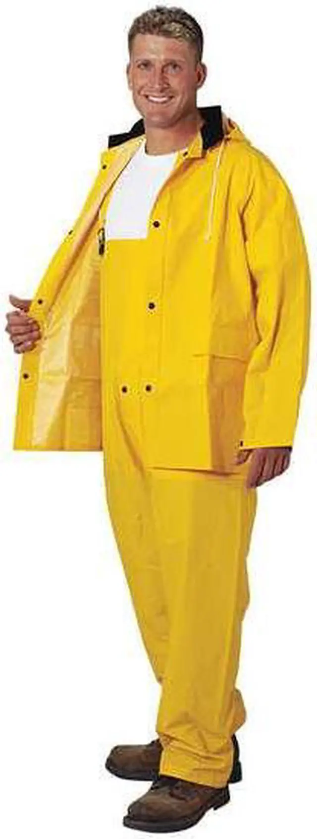 California Proposition 65: This product contains a chemical known to the State of California to cause birth defects or other reproductive harm. 3-Piece Rainsuit with Detachable Hood, Color Yellow, Material Polyester, PVC, Hood Style Detachable, ANSI Class Not Rated, High-Visibility No, Size L, Jacket Length 31 1/2 in, Fly Closure Type Snaps, Style 3 Piece Rain Suit with Jacket/Bib Overall, Includes Lining Yes, Lining Material Polyester, PVC, Thickness 0.3 mm, Features Wind Resistant, Includes Hood Yes, Hood Features Drawstring Closure, Number of Coat Pockets 2, ANSI Type Unrated, Jacket Entry Closure Type Snaps, Inseam 29 1/2 in. This item has been restricted from sale in the following state (s): []