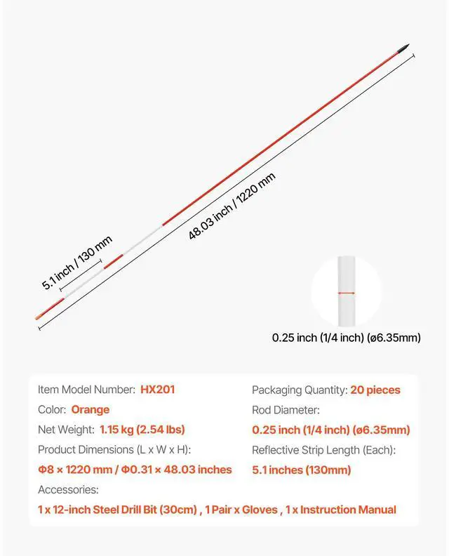 Rod Size: 6.35 × 1200 mm / 0.25 × 47.24 inches