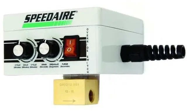 Timed Electric Auto Drain Valve, Pipe Size 1/4 in NPT, Drain Size 1/4 in, Drain Rate 4.0 gpm, Adjustable Drain Cycle 1 min to 60 min, Purge Time 1 sec to 30 sec, Voltage 115 V, Max. Pressure 250 psi, Operating Temp. Range 35 Degrees to 165 Degrees F, Hz 60, Amps AC 0.3 A, Enclosure NEMA 5, Body Material ABS Plastic, Brass, Overall Height 3 5/16 in, Overall Width 5 39/64 in, Overall Depth 4 1/2 in, Includes 6 ft Heavy Duty Grounded Power Cord, Drain Strainer.