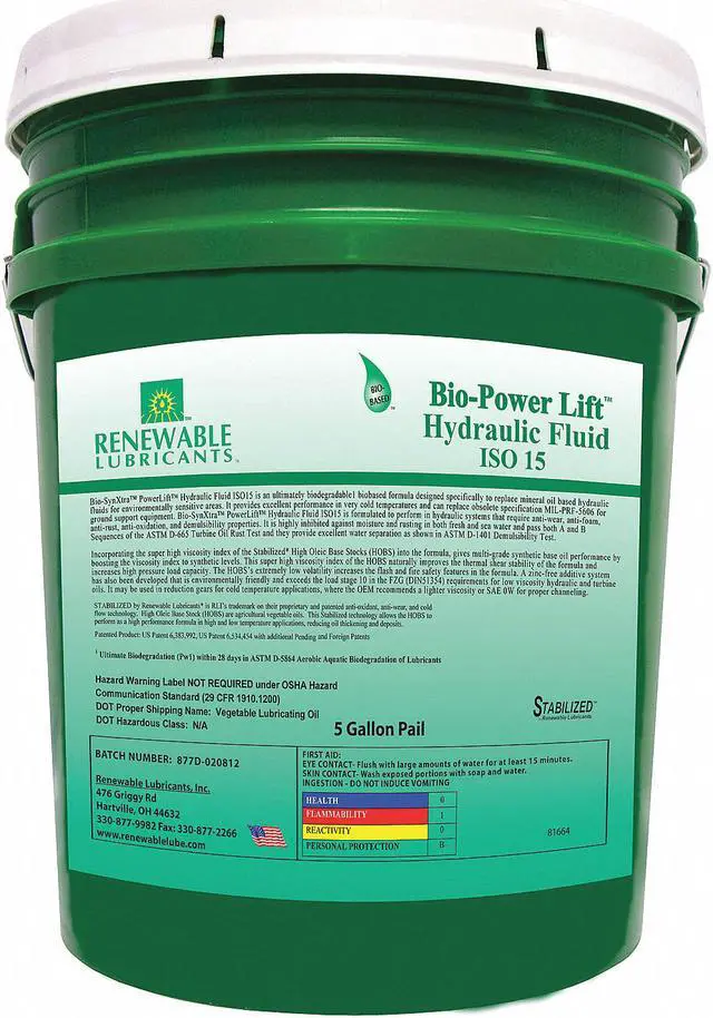 Vegetable Oil Hydraulic Oil, 5 gal. Pail, ISO Viscosity Grade : 15