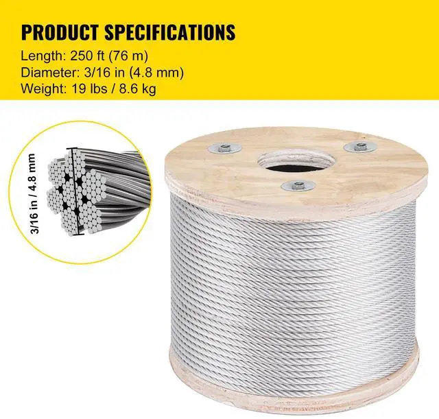 304 Stainless Steel Wire Rope Cable, 3/16", 7x19, 250 ft reel