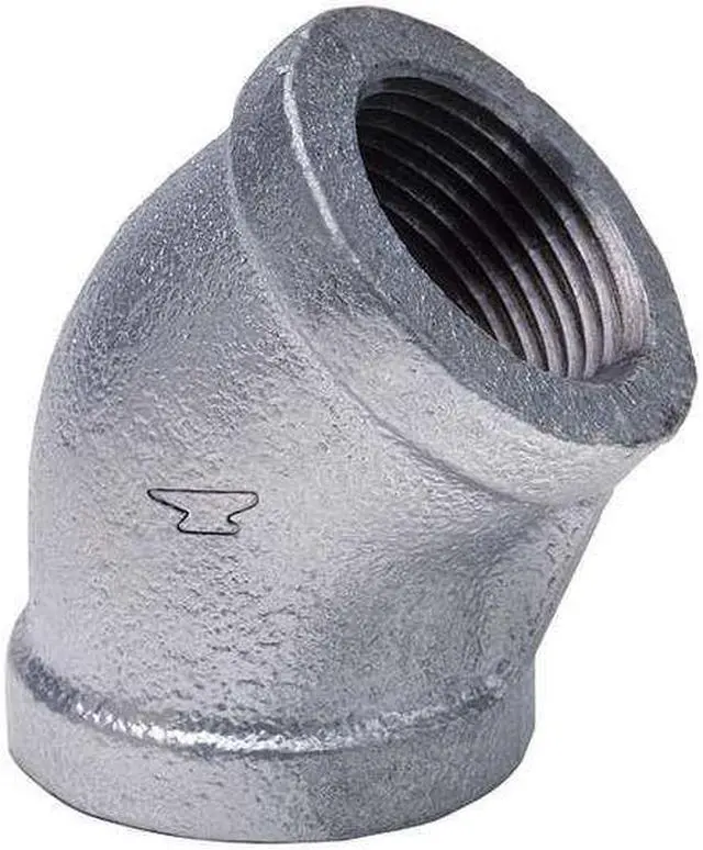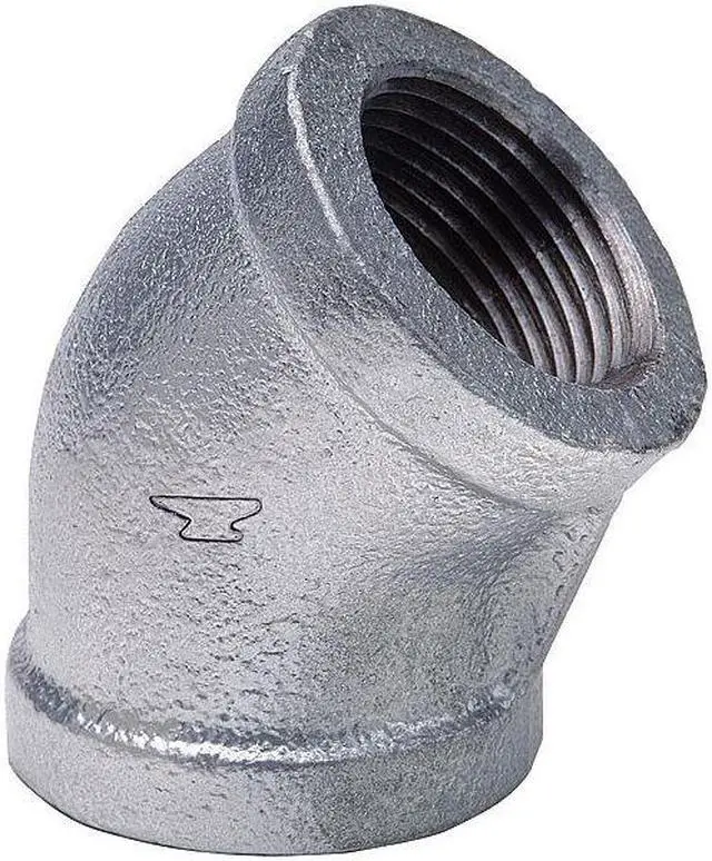 45 Degrees Elbow, Malleable Iron, Galvanized, Class Class 150, For Pipe Schedule 40, 3/4 in, Female, NPT, 3/4 in, Female, NPT, 300 psi @ 150 Degrees F Maximum Operating Pressure. This item has been restricted from sale in the following state (s): []