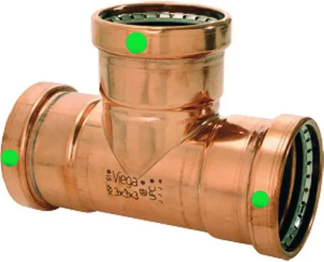 Crimp Tee Fitting, Application Potable Water, Fitting Side A Connection Type Press-Fit, Fitting Side B Connection Type Press-Fit, Fitting Side C Connection Type Press-Fit, Fitting Side A Copper Tube Size 2 1/2 in, Fitting Side B Copper Tube Size 2 1/2 in, Fitting Side C Copper Tube Size 2 1/2 in, Fitting Material Copper, Includes Center Stop Dimple Center Stop, O-Ring Material EPDM, Specific Fitting Shape Tee, Overall Length 7 1/32 in, Maximum Operating Pressure 200 psi. This item has been restricted from sale in the following state (s): []