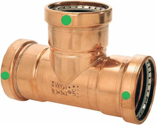 Crimp Tee Fitting, Application Potable Water, Fitting Side A Connection Type Press-Fit, Fitting Side B Connection Type Press-Fit, Fitting Side C Connection Type Press-Fit, Fitting Side A Copper Tube Size 2 1/2 in, Fitting Side B Copper Tube Size 2 1/2 in, Fitting Side C Copper Tube Size 1 1/2 in, Fitting Material Copper, Includes Center Stop Dimple Center Stop, O-Ring Material EPDM, Specific Fitting Shape Reducing Tee, Overall Length 5 31/32 in, Maximum Operating Pressure 200 psi
