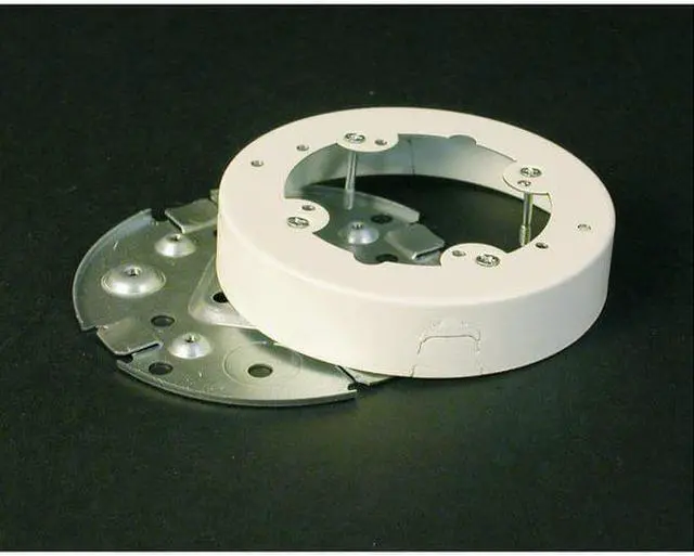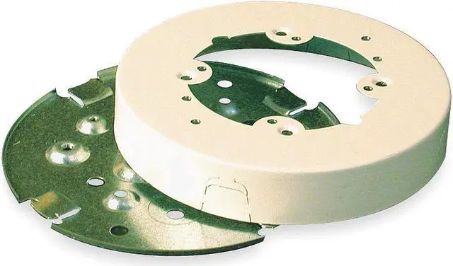 Raceway Base, Round Fan, Solid Base, Steel, Ivory, Cover Accepts Fan Bracket With Mounting Centers Of 3.2 Inch, Base Has Six Mounting Holes And 4 1/2 Inch Trade Size Knockouts, #10 Mounting Studs Provided, Rated For Fans And Fixtures Up To 50 Pounds, Cover Has Double Twistouts, Break Out Lower Twistout For Use With G0336682, V500, And Both Twistouts For Use With G1596603, V700 , 5.5 Inch Diameter, 1 Inch Height. This item has been restricted from sale in the following state(s): []