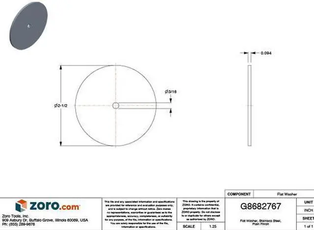 Magnetic Mounting Disk, Flat Washer Type Standard, Material T409 Stainless Steel, Material Grade/Class Not Graded, Finish Bright (Uncoated), For Screw Size #8, Inside Diameter 0.19 in, Outside Diameter 2 1/2 in, Maximum Thickness 0.094 in, System of Measurement Inch, Minimum Thickness 0.094 in, Color Silver