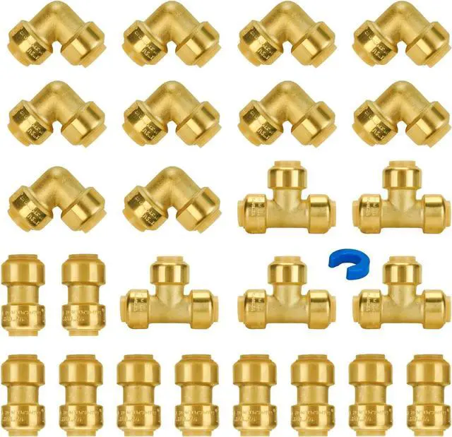 PACKAGE INCLUDES: Pushfit 1/2 Inch Coupling (10 PCS); Pushfit 1/2 Inch Elbow (10 PCS); Pushfit 1/2 Inch Tee (5 PCS); 1/2 Inch Disconnect Clip (1 PC).