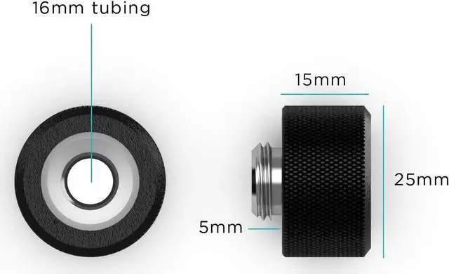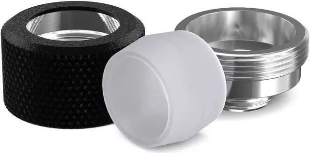 16mm OD Rigid PETG tubing 16mm OD Rigid PMMA tubing 16mm OD Rigid Copper tubing Included Parts 6x Coated cap 6x Nickel plated base 6x Bottom sealing o-ring 6x Tubing sleeve seal insert Installation No installation tool required. Finger tighten only. SX caps are coated with a durable powder coat, but we still recommend handling with care so you can enjoy the finish for years to come. If tools have to be used to loosen, make sure to cover them with a soft material to protect the finish.
