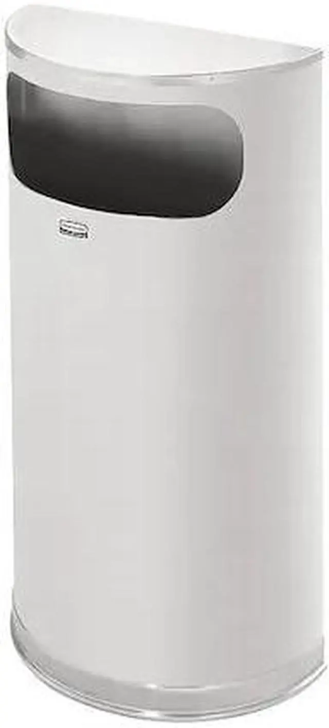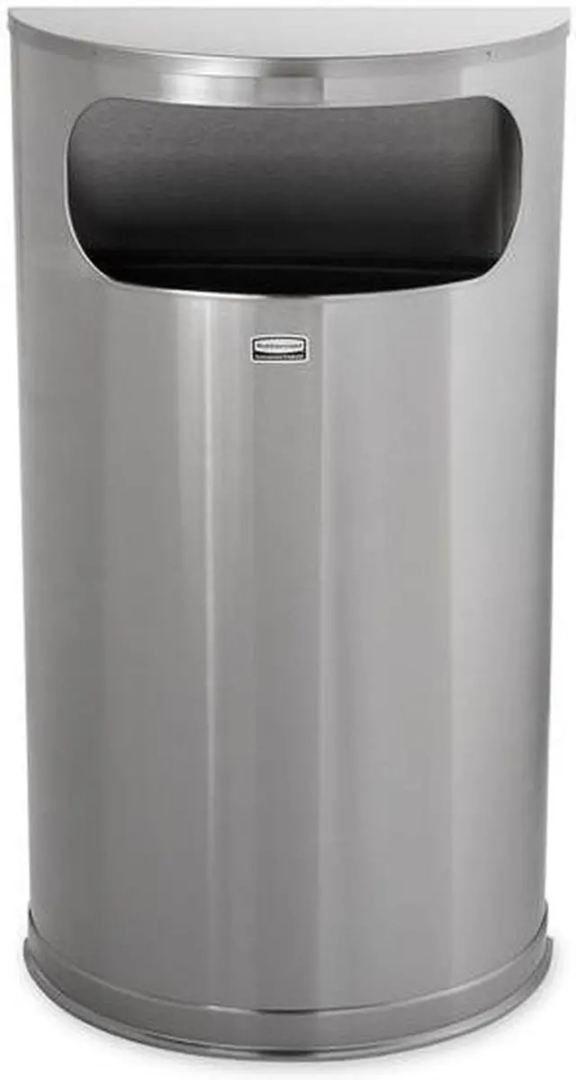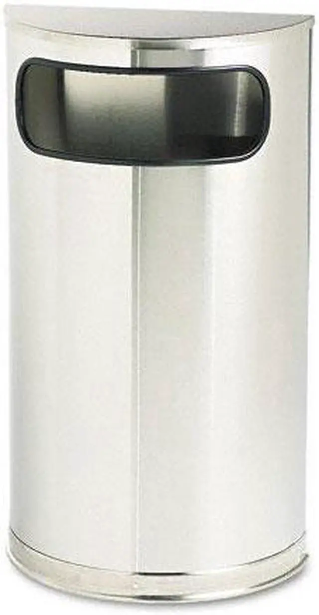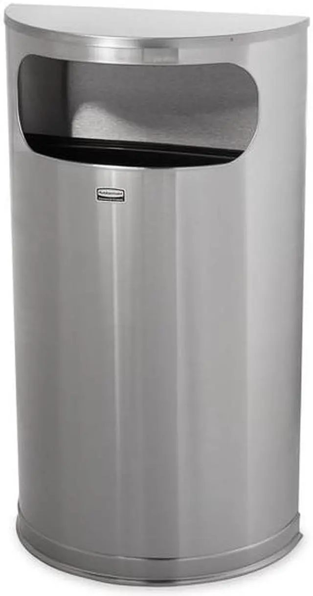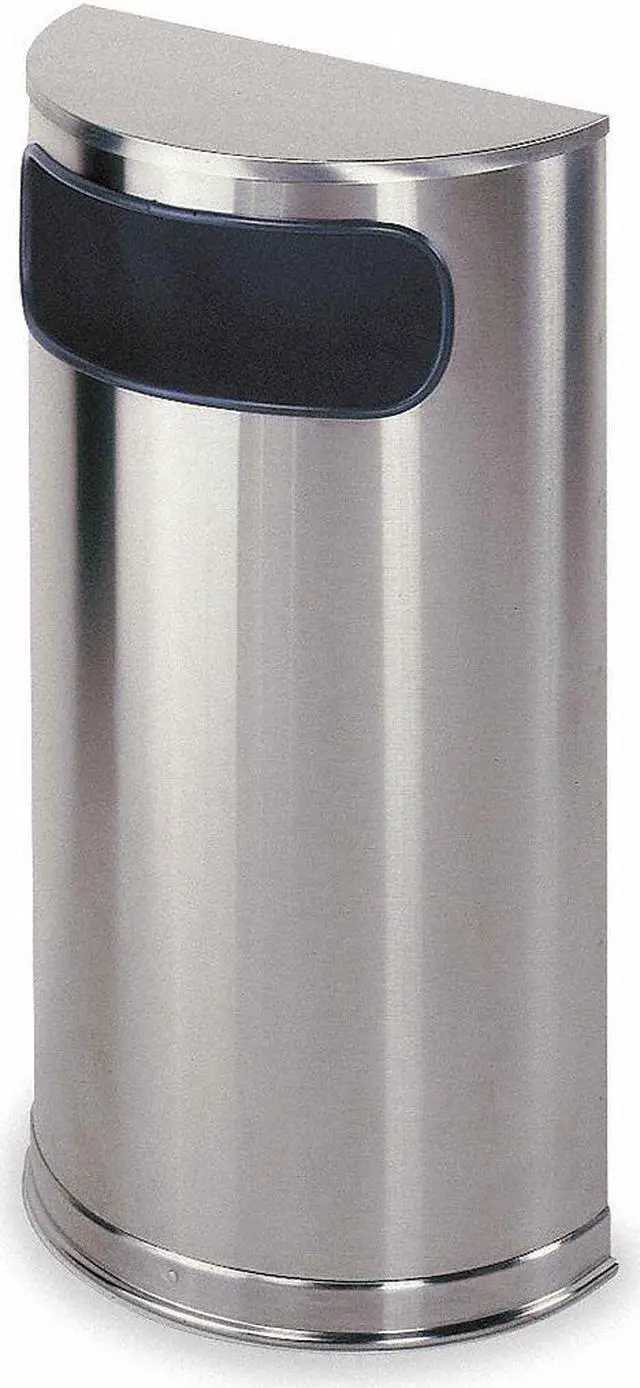 Fire-Resistant Wastebasket, Half-Round, Flat with Side Opening, 9 gal, Silver, Height 32 in, Width/Diameter 17 1/2 in, Depth Not Applicable, Metal, Stainless Steel, Satin, Indoor, Stationary, Lid Included, Lift Up, None, Free-Standing. This item has been restricted from sale in the following state (s): []