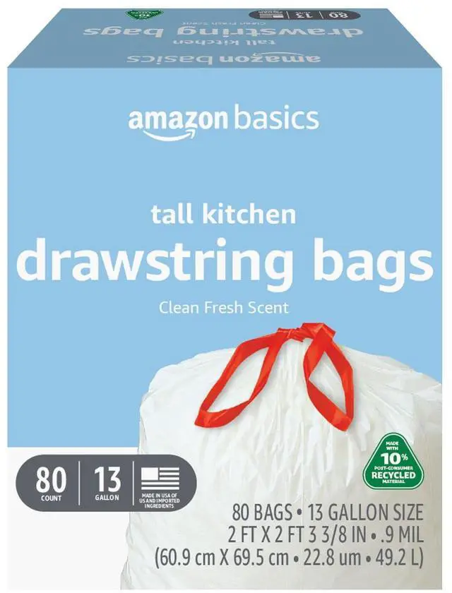 13 Gallon Tall Kitchen Drawstring Trash Bags, Clean Fresh Scent, 10% Post Consumer Recycled Material, 80 Count