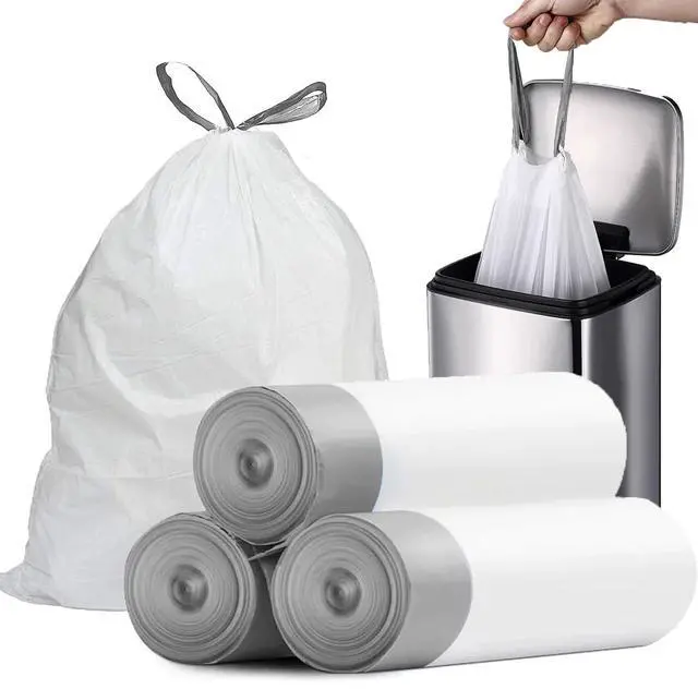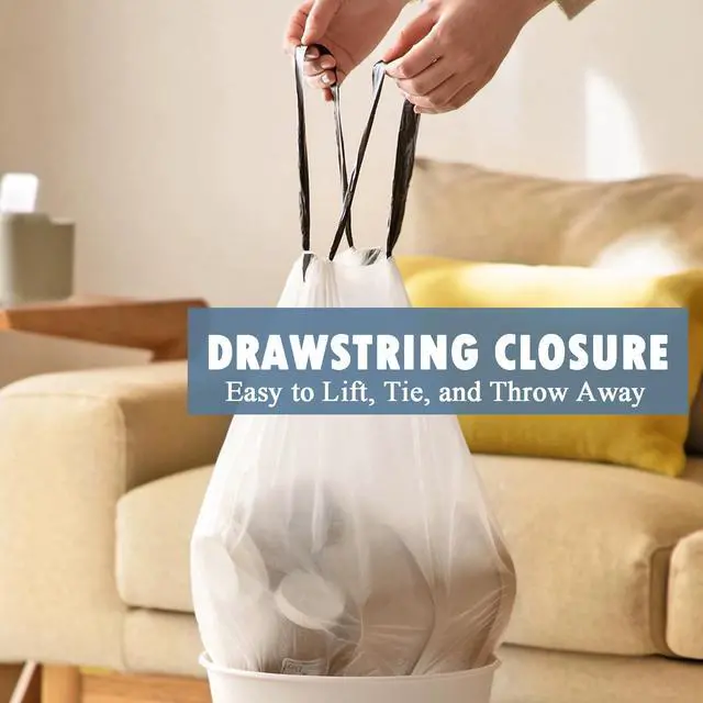 Drawstring Closure - The drawstring handle makes it easy to close the bags securely when ready to toss out. With a quick cinch, the small trash bags are easy to lift, tie, and throw away. Pre-separated Bags - The 4 gallon trash bag is individually separated and interleaved in the roll. Just grab each trash bag effortlessly without the trouble of tearing along the hard-to-find perforation. 4 Gallon Trash Bag - With 18.5 W x 18.5 H dimensions, these small garbage bags fit up to 4 gallon capacity for your daily needs. Perfect fit for most small trash baskets. Sturdy for Daily Waste - With great durability, these 4 gal small garbage bags hold up impressively well with regular trash without tearing, but not for sharp objects. Versatile Usage - Suitable as office, bedroom, and bathroom trash bags. Manage everyday trash so much easier, keeping your space clean and organized without any hassle.