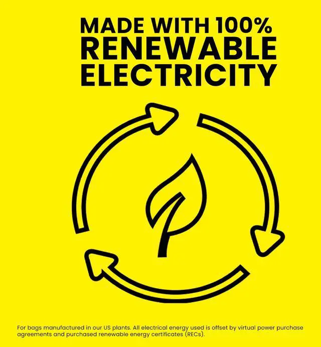MADE WITH 100% RENEWABLE ELECTRICITY*: For bags manufactured in our US plants, all electrical energy used is offset by virtual power purchase agreements and purchased renewable energy certificates