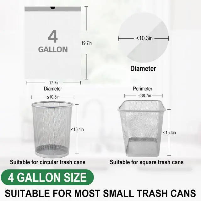 Size: Our 4 gallon trash bags are 17.7 W x 19.6 H, suitable for most 15L trash cans.