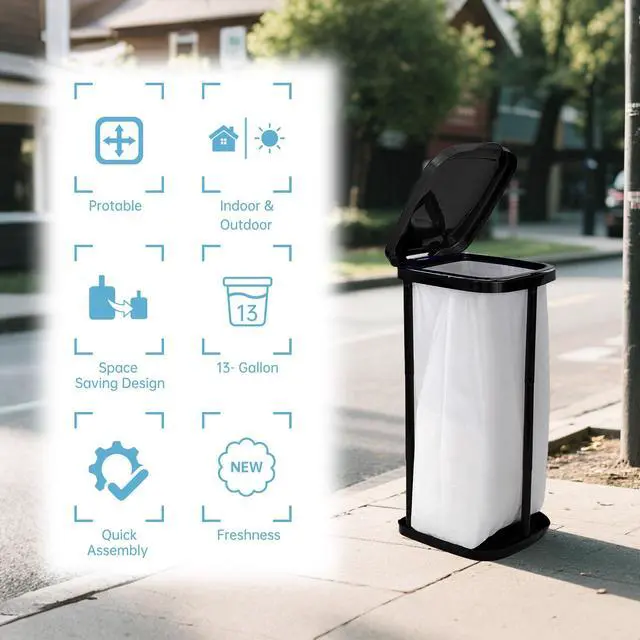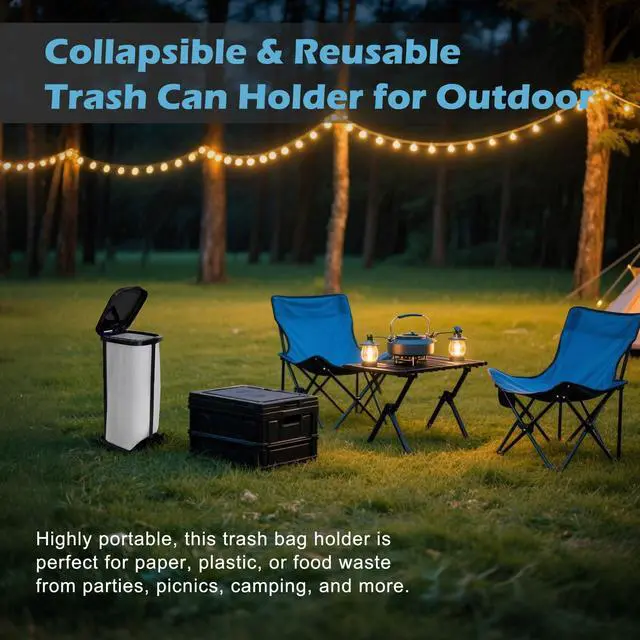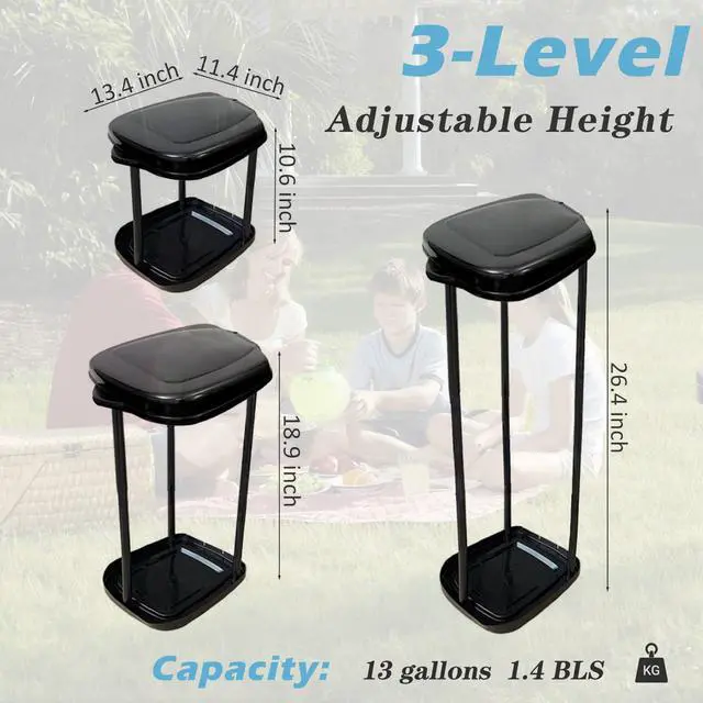 The ultimate portable trash bag holder that transforms in seconds! the collapsible trash can redefines convenience with its 3-height adjustable design (10.6inch compact mode to 26.4inch full capacity), offering versatile use as a sturdy outdoor trash can with lid for patios, a space-saving trash bag holder stand for tiny apartments, or a reliable camping trash bag holder for adventure trips.